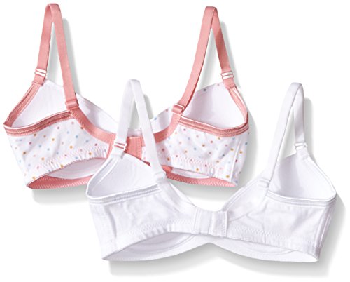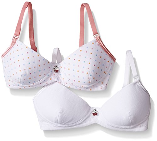 This yummy new two-pack of teen bras consists of two thin foam bras designed for support and modesty for growing girls. One in plain white and one in a fun multi-colored spot print with pink straps. Both bras have a fun cupcake charm at the center front. The design and fit follow our existing coral daisy two-pack.Feature