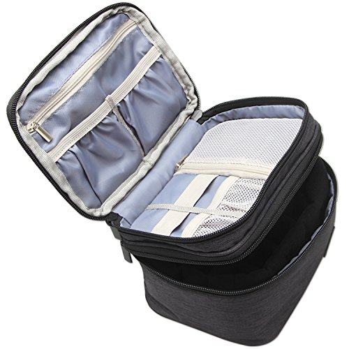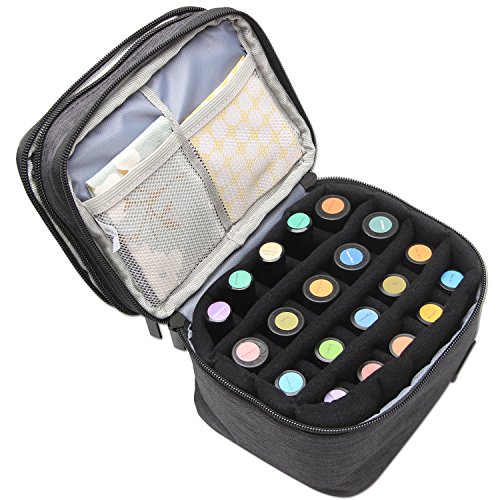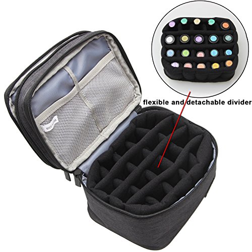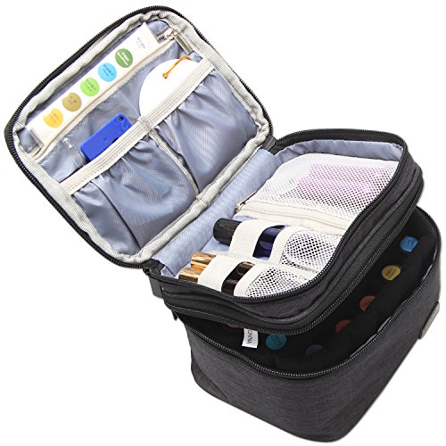 Double Layer Design. Several pockets and elastic bands for storing empty essential oil bottles, openers, droppers, funnels and other small accessories. A large compartment (with adjustable bottle dividers) holds up to 20 bottles of essential oils (5ml to 30ml, including roller bottles).