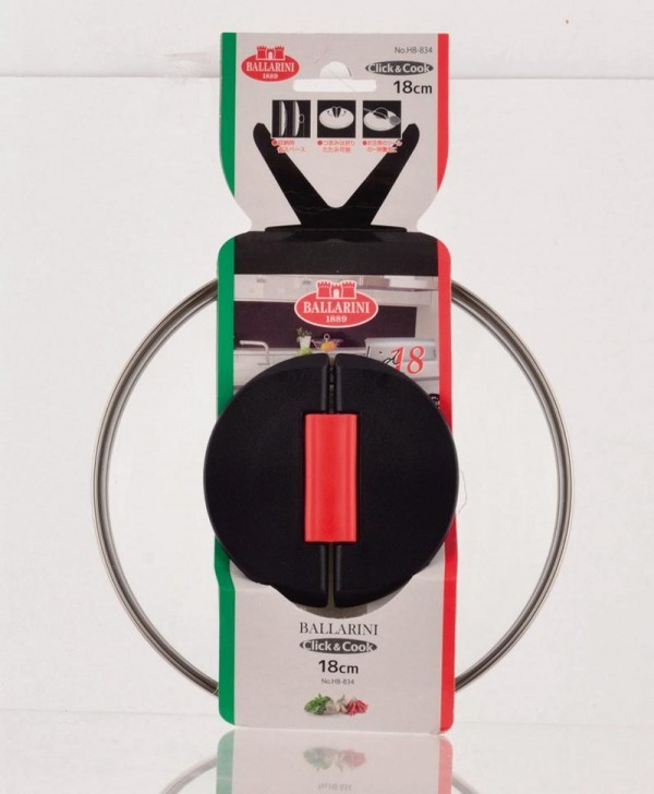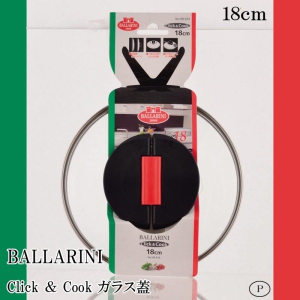 BALLARINI Click&Cook(18cm)用のガラス蓋です。蓋のツマミは、使用時は立ち上げ、使わない時は倒すことができます。 |