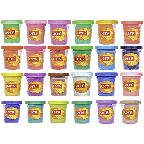 Fuel your child's creativity. This 24 color play dough set is perfect for children (and adults!) who want to play and sculpt. The clay is very soft and easy to mold. Each set includes 24 colors, 3 oz of each of the following: white, red, vermillion, bubblegum, light pink, light mauve, orange, goldenrod, yellow, spring green, kelly green, chartreuse, shamrock green, bright green, mint, violet, purple, magenta, black, brown, tan, peacock, royal blue, and blue. Purchase as a gift or add to your collection. Finished projects can be air dried to put on display.