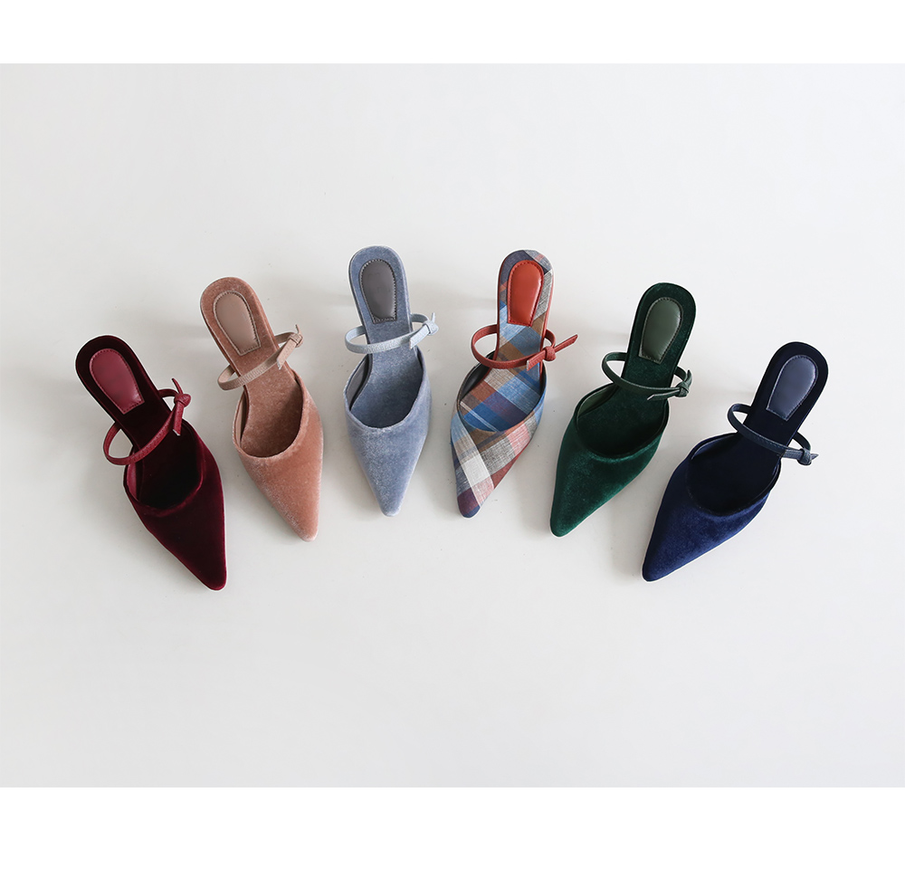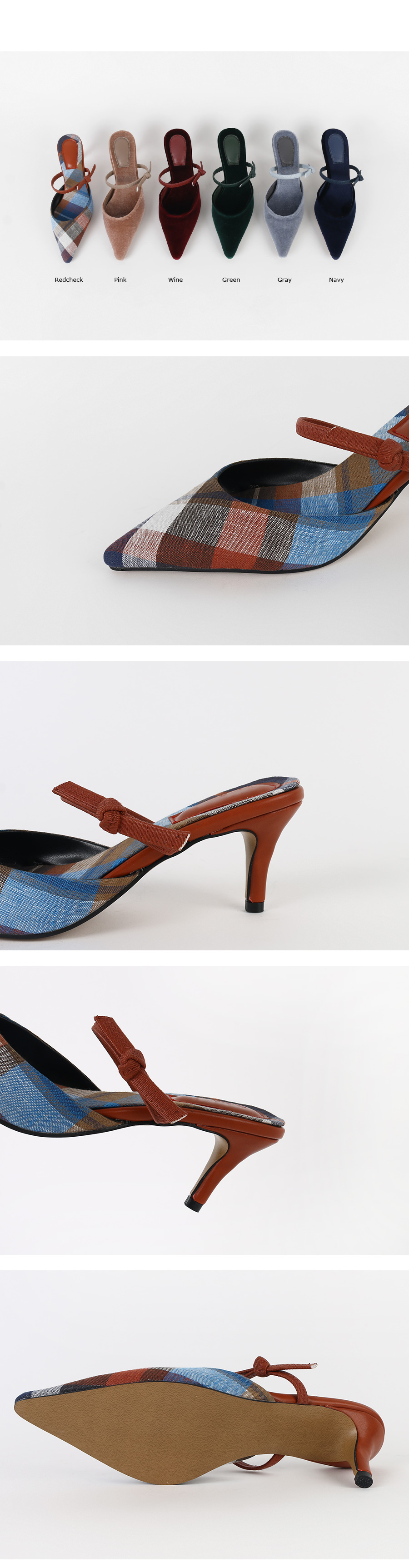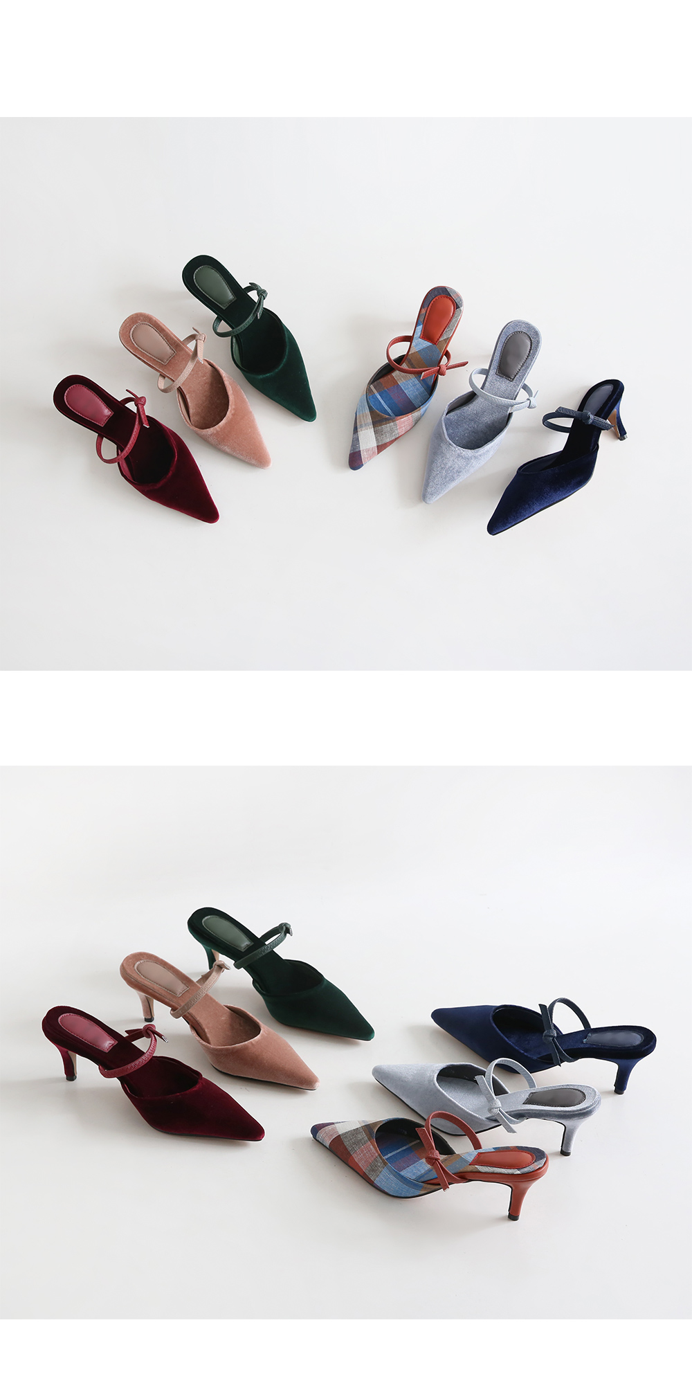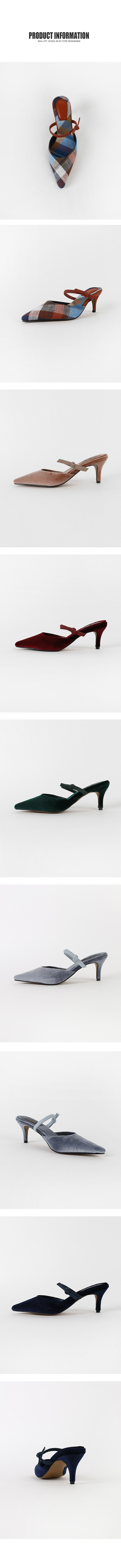 군더더기없는 스틸레토쉐입으로 빠진 쉐입이 도시적인 느낌을 선사해주며 체크패턴을 제외한 아더컬러는 벨벳으로 제작되었습니다.