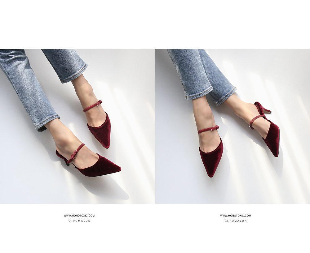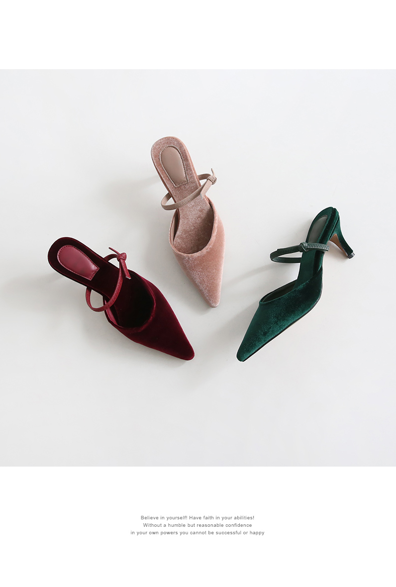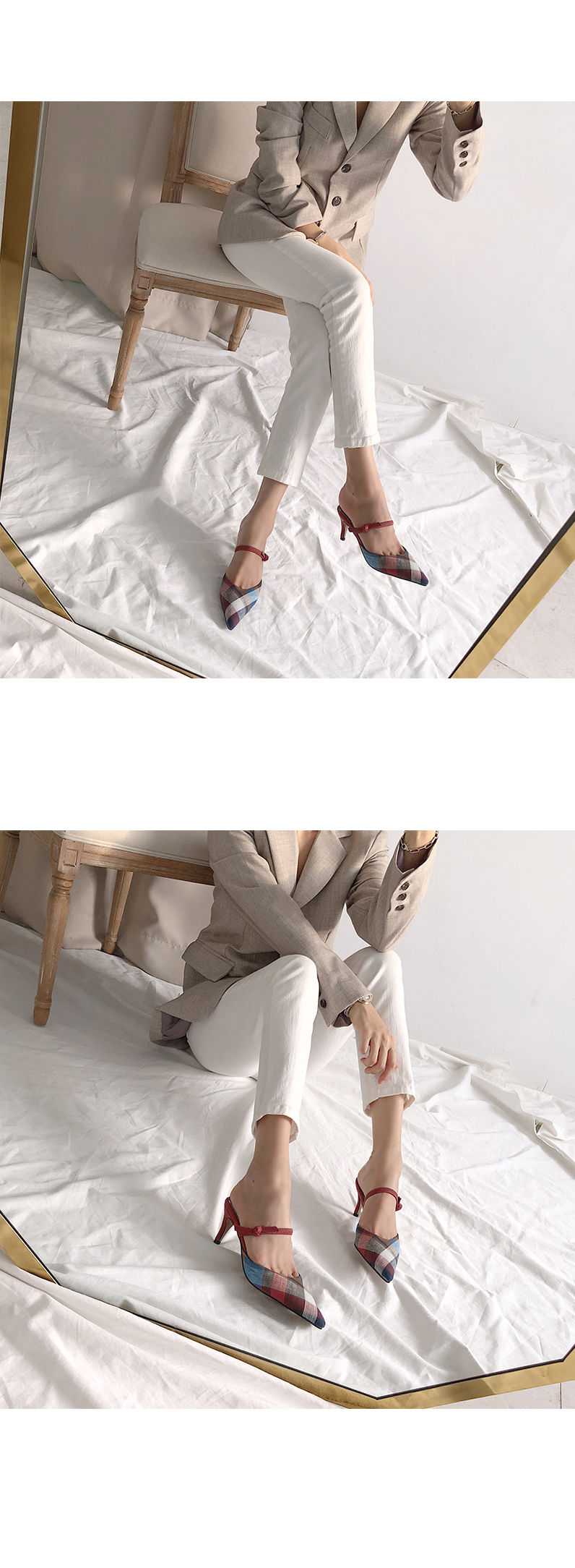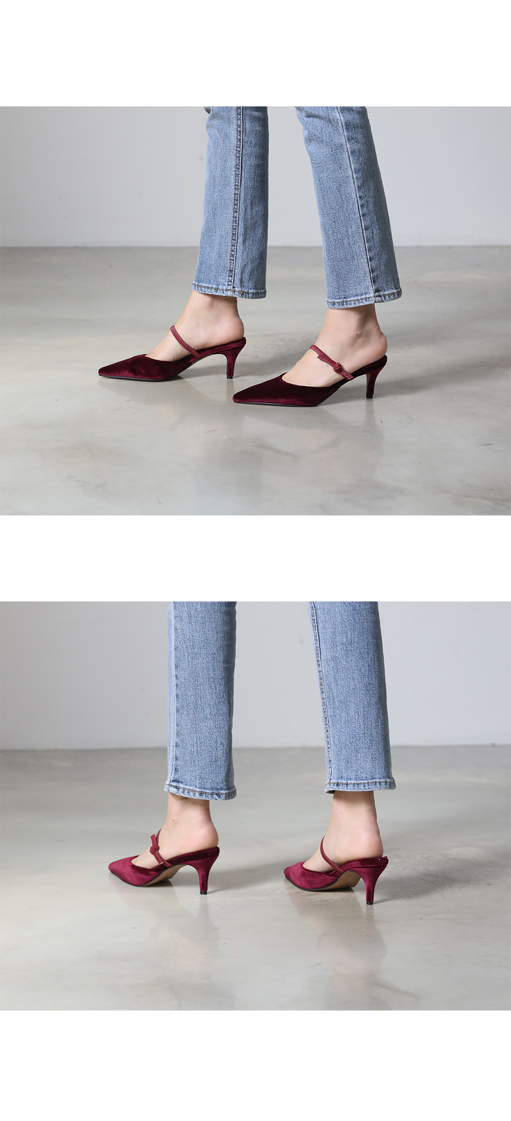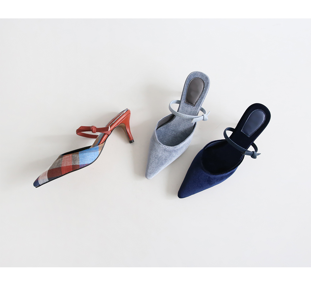 군더더기없는 스틸레토쉐입으로 빠진 쉐입이 도시적인 느낌을 선사해주며 체크패턴을 제외한 아더컬러는 벨벳으로 제작되었습니다.