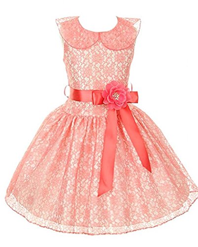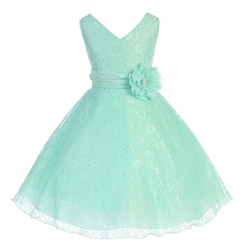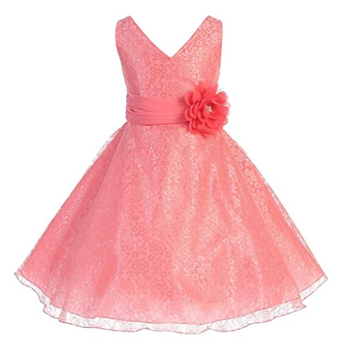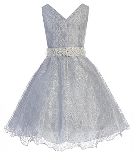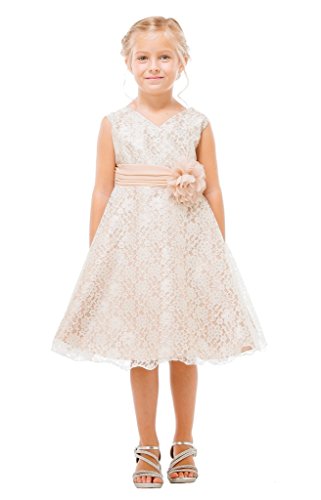 V-Neck All Over Lace Special Occasion Dress with Shawl. Back zippered closure and tie sash for a customized fit at the waist. fully lined with additional layer of net for fullness. Center Back Zipper. Tea length skirt. A Size 6 is for the Average 5 to 6 year old girl, a Size 8 is for the average 7 to 8 year old, etc. Using the Size Chart as a reference. Gold and Silver dress come with Rhinestone belt, Black/Silver, Champagne, Coral, Ivory, Mint, White come with Flower Pin on waist.Feature