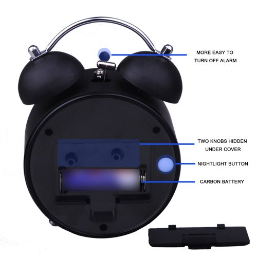 - Feature : Shell material: high quality cold rolled steel. Electroplating guarantees colors keep shinning and bright. / Silent, non ticking to ensure a good sleep and best working environment. / Separate dial for alarm (accurate to 10-minute). Much Easier to turn off alarm. Super loud alarm for heavy sleepers. / Nightlight is perfect at night. Simply press the white nightlight button when staying in bed. / User-friendly: Two knobs are hidden inside battery slot cover. Notice: the two knobs to set time and alarm are designed that way. Please don't mistake this special design for the sign that they're broken or of poor quality.