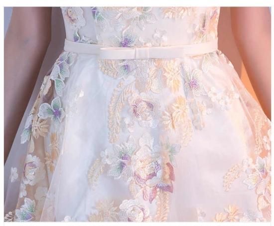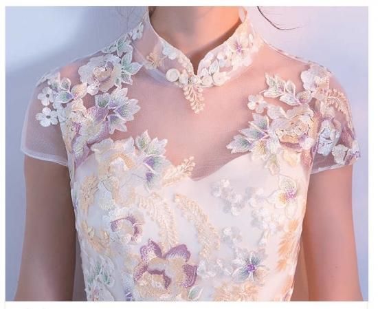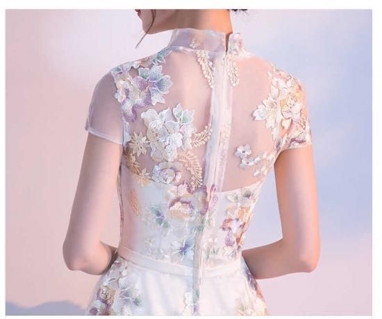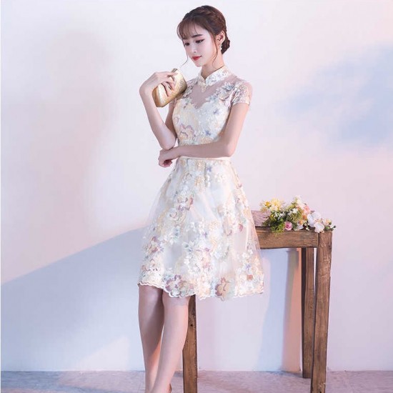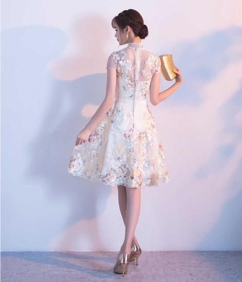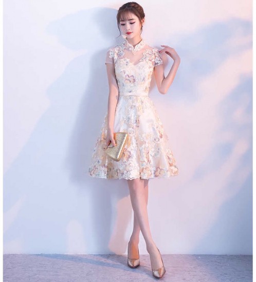パーティードレス ひざ丈 ワンピース ハイネック シャンパン 花柄刺繍 レース 総レース マオカラー シースルー フレンチスリーブ 大人 可愛い 上品 お呼ばれ drgz2167