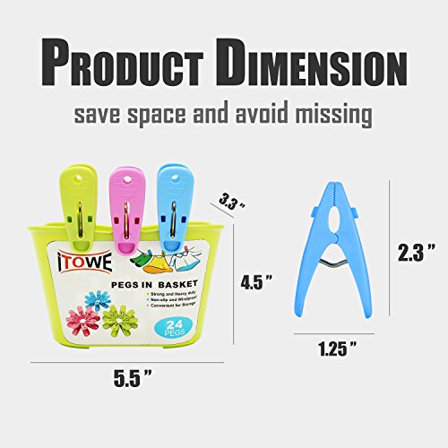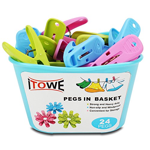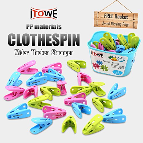 ITOWE 24 pack Plastic Pegs with Storage Basket Caddy Durable laundry Clothespin Clothes clips Pegs powerful biting force clamp for Home Using laundry Outdoor Activities Random Color