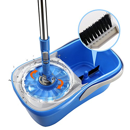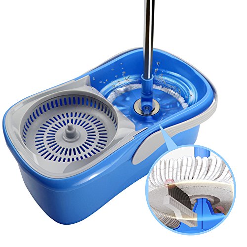 The bucket has a spinner in the part where you put the water. It also has a spinner section with a brush to wash the mop head.Put mop on top of the bucket agitator keeping the handle straight and pushing the handle down to activate spinning the mop head it will wring the mop out fast and easy.