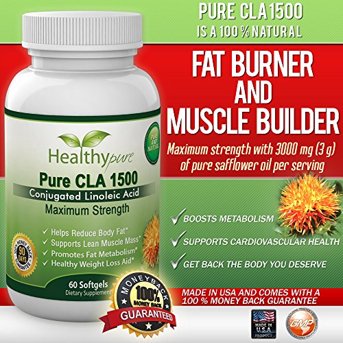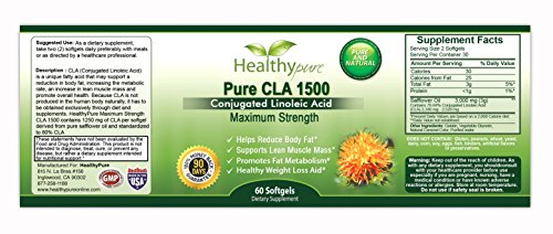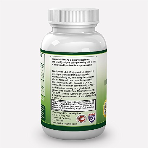 -. Feature : Fat Burner: Conjugated Linoleic Acid has been clinically shown to decrease the amount of fat your body stores after a meal, increase your rate of fat metabolism and eliminate the regaining of weight after weight loss. / Reduce Belly Fat: Research shows that CLA helps target belly fat, which is dangerous because it surrounds the vital organs, putting pressure on them and starving them of oxygen. / Why Dietary Supplements: Changes in farming, food processing, and the modern diet have contributed to an 80% reduction in the amount of CLA we receive from food and the need For CLA pills. / HealthyPure CLA 1500 is formulated with highest quality and pure ingredients in a vegetarian softgel with absolutely no fillers, no binders and no artificial ingredients. / Start Burning The Extra Fat and Building Your Muscle. Order Today and Claim The Body You Deserve! HealthyPure CLA 1500 made in the USA under Strict GMP manufacturing standards and comes with 100% satisfaction money back guarantee.