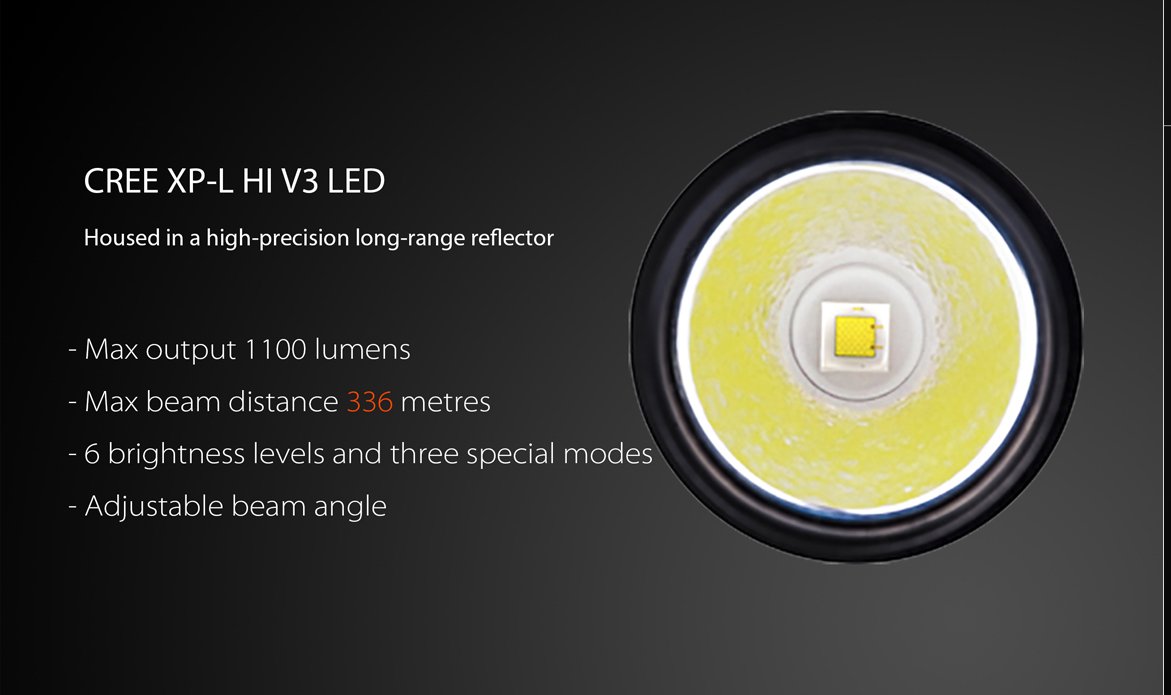 Aircraft aluminum alloy construction, protection class IPX-8 (2M), shock resistance also strong LED flash light