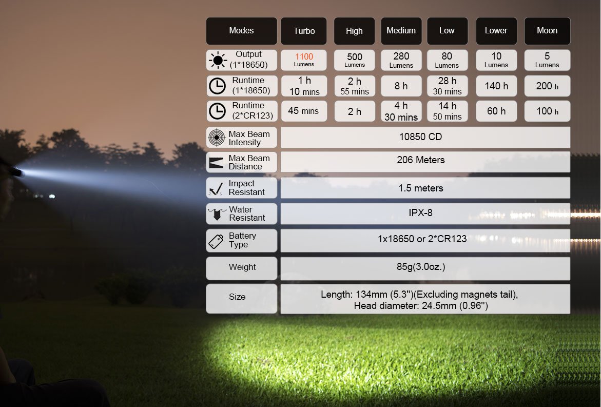 Battery used: 2xCR123A or 1x18650 (16340 lithium-ion batteries prohibited)