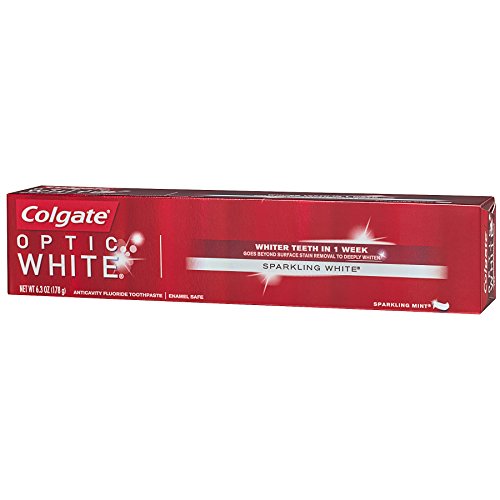 Colgate Optic White Sparkling Mint Toothpaste is specially designed to help you get a white smile while freshening your breath. It delivers whiter teeth in one week (for best results, use as directed for 4 weeks), and goes beyond surface stain removal to deeply whiten (brushing twice daily for 4 weeks). Its enamel-safe, anticavity fluoride formula helps protect teeth from cavities while removing stains for the white, fresh smile you’ve always wanted.Feature