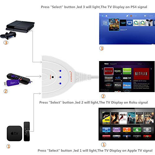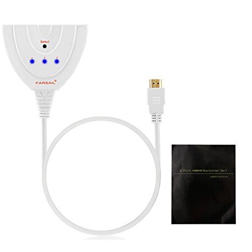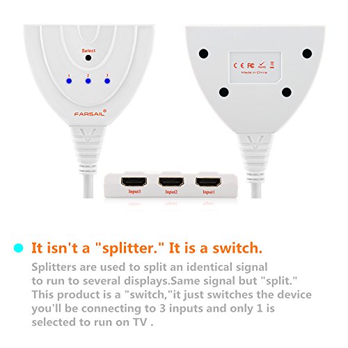 HDMI Switch - FarSail 3 Port HDMI Cable Switches Switcher Selector Support 1080P 3D for PS3 PS4 Xbox One STB Chromecast Blue-ray DVD Roku VCR Cable box