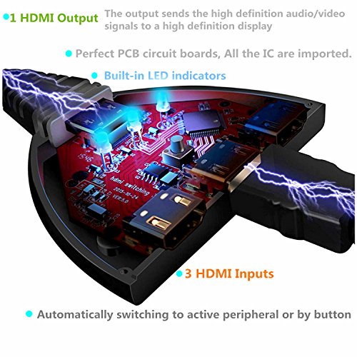 - How it work :HDMI switcher consist of 3 inputs ,1 hdmi cable .The 0.3 meter hdmi cable plugs into the hdmi port on your HD tv .On the other side of this hdmi switch hub there are three outlets into which you can plug three devices like PS4 ,XBOX one or Amazon Fire Stick .There are 1, 2 & 3 outlets with lights showing which device is connected and even a little button so you can switch from one outlet to another.