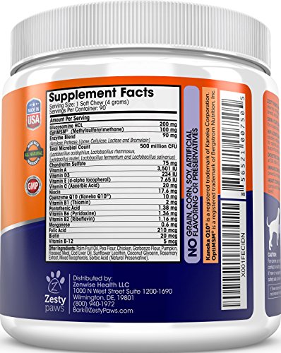 ZESTY PAWS 5-IN-1 MULTIVITAMIN BITES are delicious chewables with over 35 essential vitamins, minerals, and nutrients that provide daily nutritional support for dogs of all ages (including puppies and senior dogs), breeds, and sizes (including large and small canines). This supplement contains an advanced blend of numerous, quality healthy ingredients beneficial for your canine including glucosamine chondroitin, cod liver oil (containing omega-3 fatty acids), and other vital vitamins and minerals essential for canine health. Our multivitamins were especially designed to aid the digestive functions, immune system health, cardiovascular support, skin and fur health, and joint & hips support for overall wellness for your pets. These bite-sized multi-vitamin supplements are chicken flavored, letting them double as a healthy treat for your pet and easy to use - making everyone happy.Feature