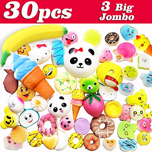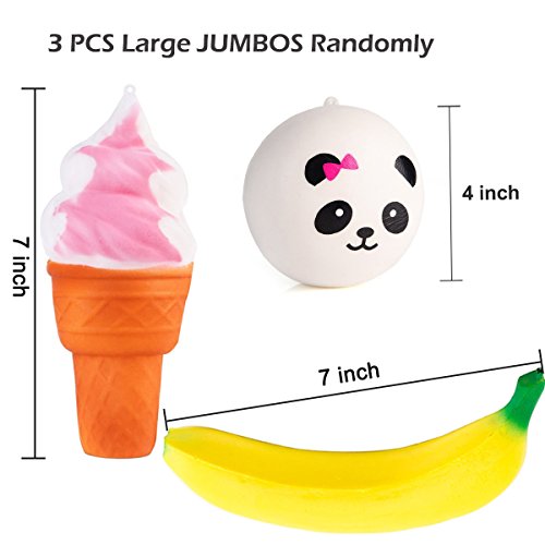 Material: Environmental polyurethane foam (PU) Jumbo Size: Length: 10-16cm Thickness: 6cm Others Size: Length: 4-6cm Thickness: 2-4cm Pattern: 30 random but not repeat, Including 3 big jumbo(usually are panda, ice cream, banana) Package included: Panda, banana, bun, cat, hamburger, bread, cookies, toast, donuts, ice cream and so on. Color: random