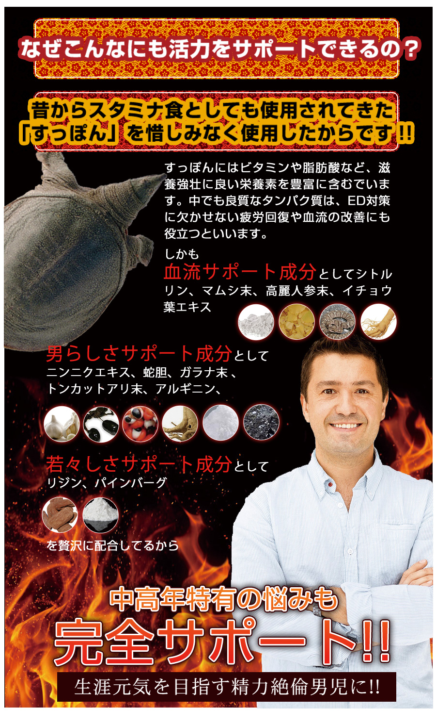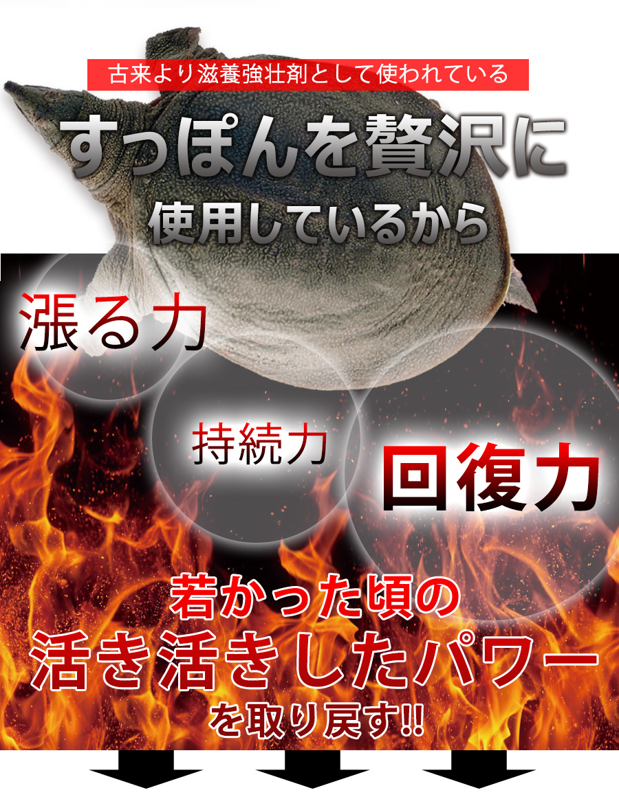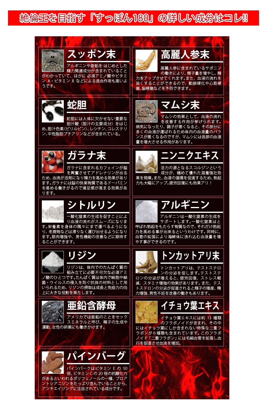 スッポン末、高麗ニンジン末、食用酵母(亜鉛、銅、セレン、マンガン、モリブデン、クロム含有)、ウミヘビ末、マムシ末、ガラナ末、赤ワインエキス、ニンニク末、L-シトルリン、トンカットアリ末、イチョウ葉エキス末、セルロース、ステアリン酸カルシウム、L-アルギニン、L-リジン、微粒酸化ケイ素