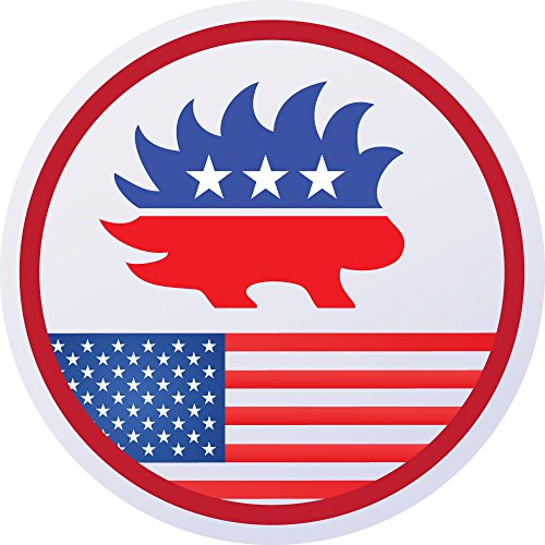 - A white magnet with red stripe around the outer edge, a porcupine in the center and an American flag at the bottom