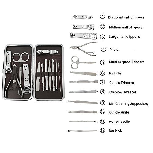 Package Included: 1*Diagonal nail clippers 1*Midium nail clippers 1*Large nail clippers 1*Dead shin clamp 1*Eyebrow shear 1*Nail file 1*Double-headed pick 1*Tweezer 1*Push the skin tool 1*Off knife 1*Acne needle 1*Ear digging