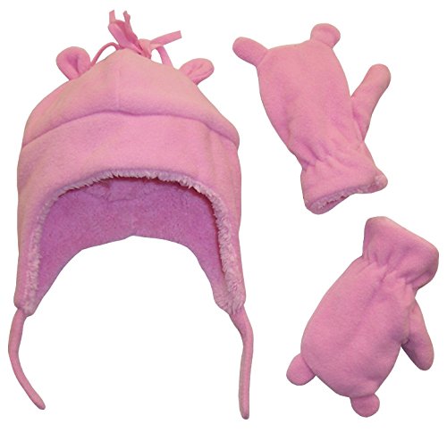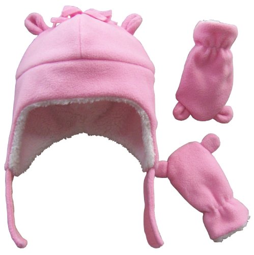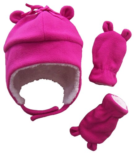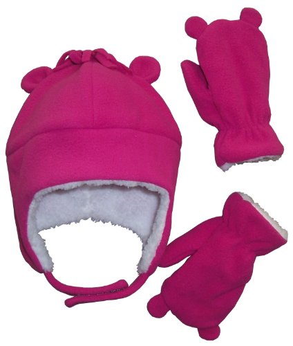 Binding : Apparel Product Description N'Ice Caps TM girls soft sherpa lined bear ears hat and mitten set. Velcro chin strap on hat, elastic on mitten wrist, fleece hair on hat. Very soft and comfortable. Color options: pink, fuchsia, multi color tye dye print velboa, light purple. 4 sizes. One size fits 3-6 months; One size fits 6-18 months; One size fits 18-36 months (label says 2T-4T, we recommend for 18-36mos); One size fits 2-3 years; One size fits 3-5 years (label says 4-7yrs, we recommend for 3-5yrs). For sizes 3-6 months and 6-18 months, the mittens do not have thumbs. For the larger sizes, 18-36 months, 2-3 years, and 3-5 years, the mittens have thumbs. Tested and approved as per CPSIA standards. 0
