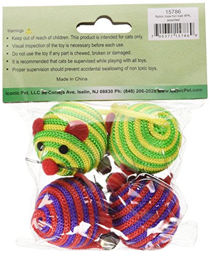 -. Binding : Misc. -. Brand : Iconic Pet -. Color : Multi -. EAN : 0700371157869 -. Feature : Perfect toy for any cat / A playful fun toy for your cat / Dimensions: 1.6" (4cm) -. Label : Iconic Pet -. Manufacturer : Iconic Pet -. Model : 15786 -. MPN : 15786 -. PackageQuantity : 1 -. PartNumber : 15786 -. ProductGroup : Pet Products -. ProductTypeName : PET_SUPPLIES -. Publisher : Iconic Pet -. Studio : Iconic Pet -. Title : Iconic Pet Nylon Rope Fun Ball, Assorted, 4-Pack -. UPC : 700371157869