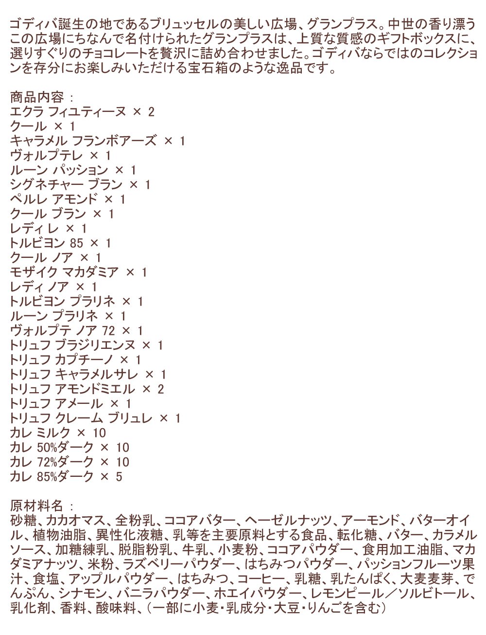 ゴディバ誕生の地であるブリュッセルの美しい広場、グランプラス。中世の香り漂うこの広場にちなんで名付けられたグランプラスは、上質な質感のギフトボックスに、選りすぐりのチョコレートを贅沢に詰め合わせました。ゴディバならではのコレクションを存分にお楽しみいただける宝石箱のような逸品です。