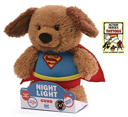 -. Binding : Toy -. Brand : GUND -. EAN : 0750783130257 -. Feature : Superman plush nightlight - Powered by two replaceable AAA batteries (included) / Automatic shutoff after 30 minutes of use / Made from soft, huggable material that meets GUND quality standards / Perfect for Play or Collection, Includes temporary tattoo book for more fun. / Suitable for 1 years old -. IsAdultProduct : 0 -. Label : Gund -. Manufacturer : Gund -. MPN : 4059366 -. PartNumber : 4059366 -. ProductGroup : Toy -. ProductTypeName : TOYS_AND_GAMES -. Publisher : Gund -. Size : 8 inches -. Studio : Gund -. Title : Gund Superman Nightlight 8 in Plush Animal with Super Heroes Sticker Book -. UPC : 750783130257