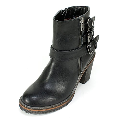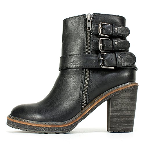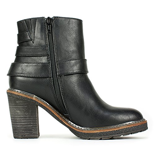 The Jo Jo ankle bootie sits on a 2 1/2 inch rubber heel giving you a fashionable lift. Decorative strap and buckles and outside zip accent the bootie yet inside zip makes it easy to get on and off. Fully lined for comfort. The treaded outsole is lightweight and flexible.Feature