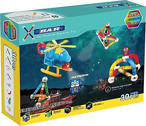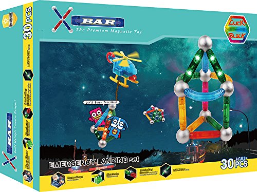 Studio : ClickBlock Publisher : ClickBlock Binding : Toy Product Description Express your imagination and creativity with heirloom-quality magnetic X-Bars. Emergency Landing set also includes 3 LED light bars which allow you to build additional new designs. You can add LED light bars to the helicopter, tower, geometric shapes and various structures that glow in the dark. All X-Bar sets are compatible with each other and come with a colorful builder's guide. Product Dimension: Metal Ball 1.25' diameter, long bar 4.5'x.5', short bar 2.75'x.5'. 0