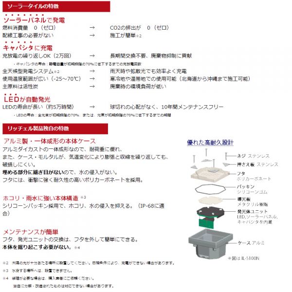 ●<リッチェル ソーラー共通特徴>①メンテナンスが簡単②高効率太陽電池を使用した全天候型発電システム③高耐久性設計④雨水に強い防水仕様⑤簡単施工