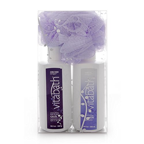 Our Vitabath Orchid Intrigue is an alluring and sensual, fragrance the night with intense purple blooms and the seductive scent of amber velvet layered with luxurious amethyst orchid, night blooming sambac jasmine, and sugared musk. This Vitabath Orchid Intrigue Contemporary Gift Set includes a 10.5 oz Moisturizing Bath & Shower Gelee, a 10 fl oz Moisturizing Lotion and a foam-enhancing pouf. this set is truly an all-in-one luxury bath and body gift set. It's the perfect gift for anyone, even you, any time of the year! Our Moisturizing Bath & Shower Gelee formula is paraben free and offers enhanced botanical extracts such as Horse Chestnut Extract, Biotin, Sunflower Oil, and Lanolin Oil. Vitamins A and E are beautifully blended to help condition the skin while cleansing. Our Vitabath Orchid Intrigue Moisturizing Lotion contains nutrients such as Vitamins A, E, C and rich emollients like Shea Butter and Aloe Vera to quickly moisturize, leaving the skin feeling soft and smooth. Amino Acids are added to help nourish and replenish skin's moisture.Feature