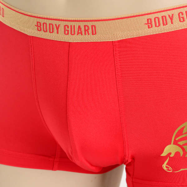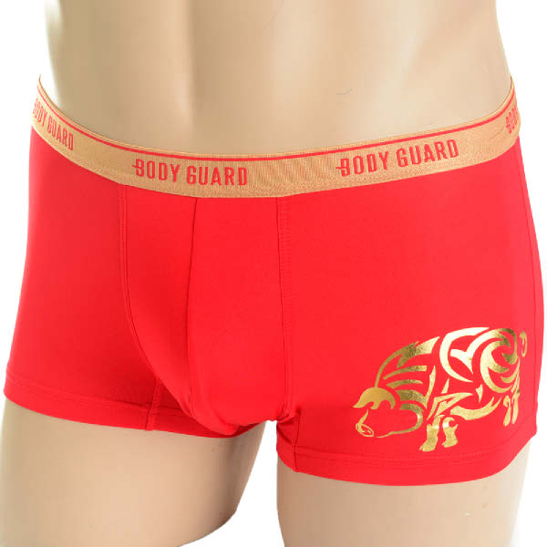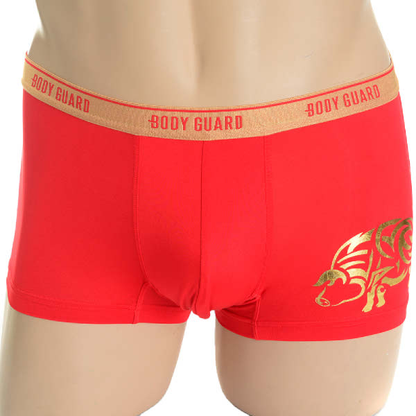 2019년 기해년을 맞이하여 복과 부를 불러오는 황금돼지를 원포인트로 사용한 남성 드로즈 제품.