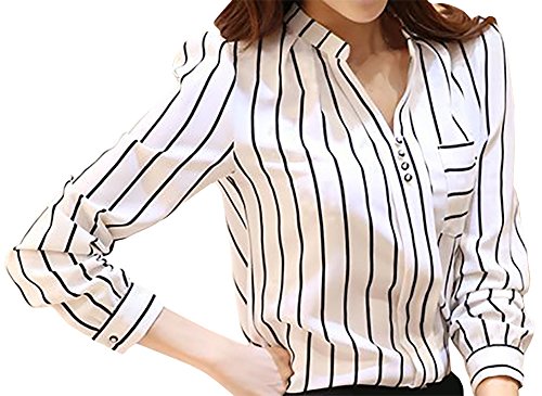 -. Feature : ≪サイズ≫【Mサイズ】着丈 58cm 身丈 58cm 肩幅 36cm バスト 84cm 袖丈 56cm 【Lサイズ】着丈 59cm 身丈 59cm 肩幅 37cm バスト 88cm 袖丈 58cm 【XLサイズ】着丈 61cm 身丈 61cm 肩幅 38cm バスト 94cm 袖丈 60cm 【2XLサイズ】着丈 62cm 身丈 62cm 肩幅 39cm バスト 100cm 袖丈 61cm / カラー:白(ホワイト)、黒(ブラック)サイズ:M L XL 2XL 色・サイズ展開も豊富になっております。やや小さめの作りですので、ワンサイズ大きめをおすすめしております。 / オシャレでエレガントなストライプ柄のスキッパーシャツ・ブラウスです。Vネックのおかげでデコルテ部分が綺麗に映えます。お気に入りのネックレスなどもさらに輝かせて見せてくれます。かわいらしさと上品さを併せ持つ女性の定番アイテムのストライプシャツはかっこよさだけでなく女性らしいフォルムになっております。シーンによって綺麗めにも可愛いらしい印象にもなるので着回し力抜群です。 / さらさらとした着心地で通気性も良く長時間着ても負担にならない素材で機能的です。形が格好良くスタイリッシュなので、デートやお呼ばれ、仕事やオフィスだけでなく卒園式、卒業式、入園式、入学式、発表会、結婚式、二次会などのフォーマルシーンにも大活躍です!春夏秋冬季節を問わず着られるのでオールシーズン使っていただけますのでいざという時に1枚持っておくと便利です。白と黒2種類あるのでシーンに合わせて選べます。 / シンプルなデザインなのでボトムスやスカートなど何でも合わせやすいシャツです。スキニーに合わせてカジュアルに、スーツに合わせてシックやフォーマルにとどんな種類も着こなせます!トレンチコートやジャケットとも合わせやすいので、様々なシーンに活躍できる1枚です。飽きの来ないブラウスは年齢も問いません!10代 20代 30代 40代 50代 60代どの年代の女性にもおしゃれを楽しんで頂けます。