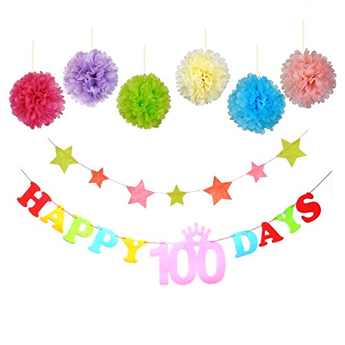 Happy 100 Days Bunting Banner Party Garland Banner With Star Garland and Set Of 6 Colorful Tissue Pom Pom Decoration Balls for Baby 100 Days Party Decoration