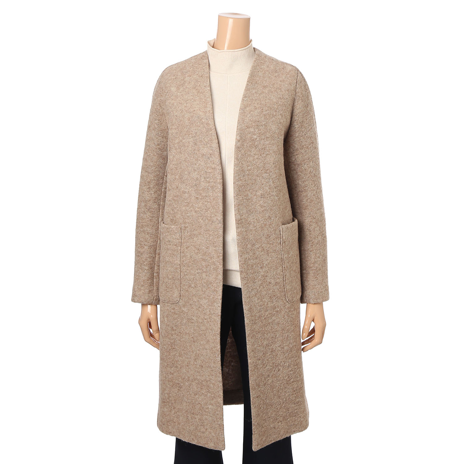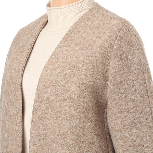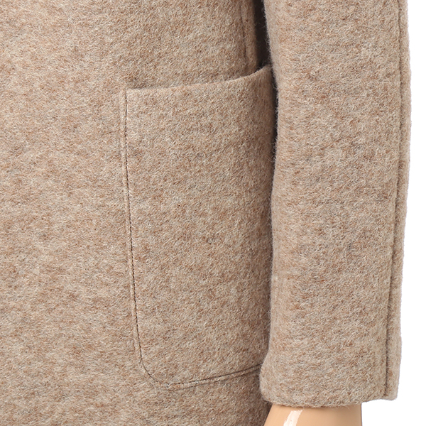 카라가 없이 깔끔하게 떨어지는 여밈 라인이 심플한 코트형 자켓입니다. 와이드한 포켓 디테일로 실용성과 스타일 모두를 충족시키는 상품입니다. 포근한 모 터치감을 즐길 수 있으며 히든 고리 구성으로 탈착의 가능합니다. 소매까지 안감 처리되었습니다.