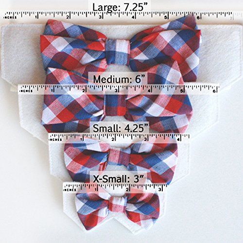 -. Binding : Misc. -. Brand : Tail Trends -. Feature : Designer dog bow tie made with multicolored 100% cotton plaid fabric / Elastic band, slip-through loops adjusts to collars of all sizes. / Wearable for all occasions / Felt collar backing have the following measurements: / XS (3" x 1.75"), S (4.125" x 2.125"), M (6" x 2.75"), L (7.25" x 4"). -. Label : Doggone Cute Inc. -. Manufacturer : Doggone Cute Inc. -. PackageQuantity : 1 -. ProductGroup : Pet Products -. ProductTypeName : PET_SUPPLIES -. Publisher : Doggone Cute Inc. -. Studio : Doggone Cute Inc. -. Title : Tail Trends Formal Bow Ties Collection for Teacup to Medium and Large Breeds