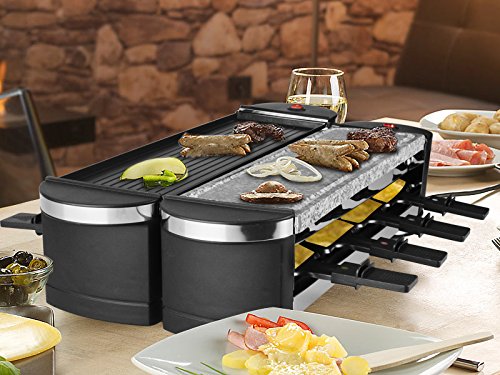 ★ The set includes a dual raclette grill, one high density granite grill stone (15" X 4.6"), one reversible cast aluminum grill plate (15" X 4.6") , eight raclette dish holders with heat resistant handles and eight spatulas