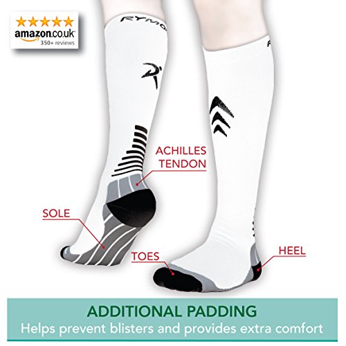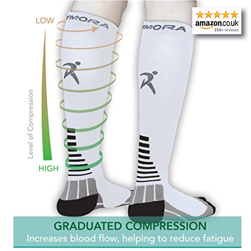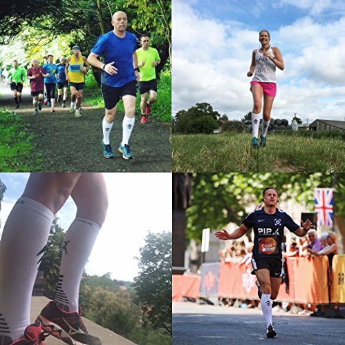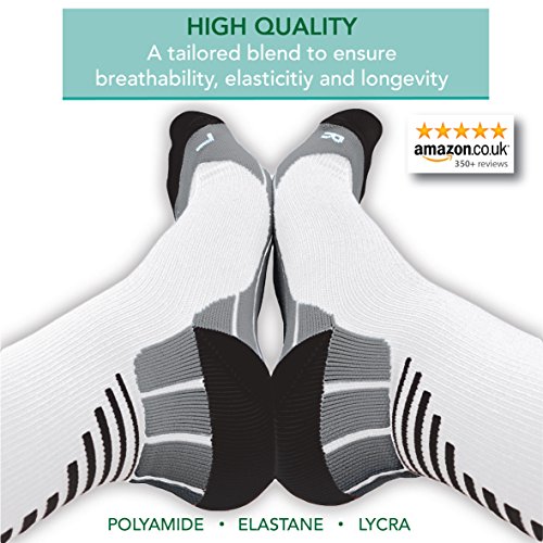 GRADUATED COMPRESSION (LABORATORY TESTED): The level of compression in the socks truly reduces from the ankle to the knee (confirmed by the UK Surgical Materials Testing Laboratory). This provides support for the calves and promotes increased blood flow, leading to increased oxygen flow to the leg muscles helping to prevent cramps and to lessen fatigue.