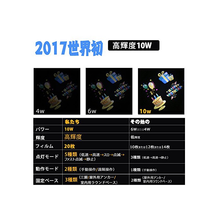 【10W업계를 리드 하는 기술】10W 보다 높은 해상 도와 밝기를 들었 led projection 라이트에,선명한 빛에 필름에 그려진 일러스트를 비춥니다.점멸 기능 신규 추가,5단계 라이트 조정:저속→고속→슬로우 점멸→퍼스트 점멸《―》정지.