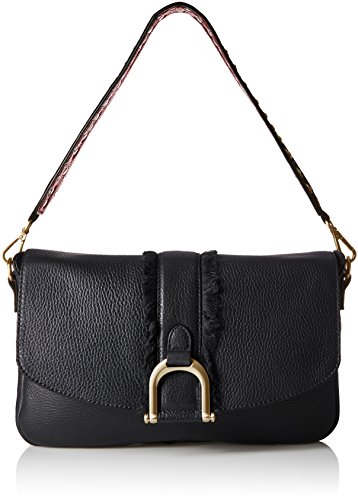 Petra convertible short shoulder bag magnetic snap flap closure strap over flap with yarn fringe and buckle vegan leather color blocking detachable shoulder strap with military studs and Sam Edelman lobster claws to d rings magnetic snap back pocket vegan leather underlining flap vegan leather trims twill lining metal zip with Sam Edelman puller and slip pockets inside with vegan leather trim metal bar with Sam Edelman embossed logo inside Sam Edelman triangle logo on back pocket