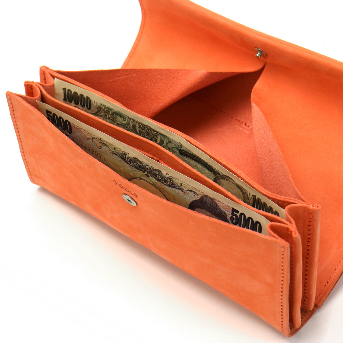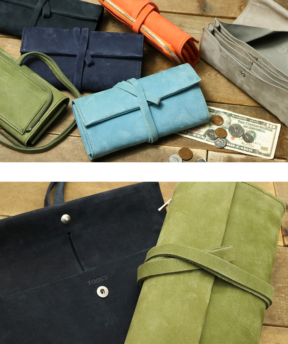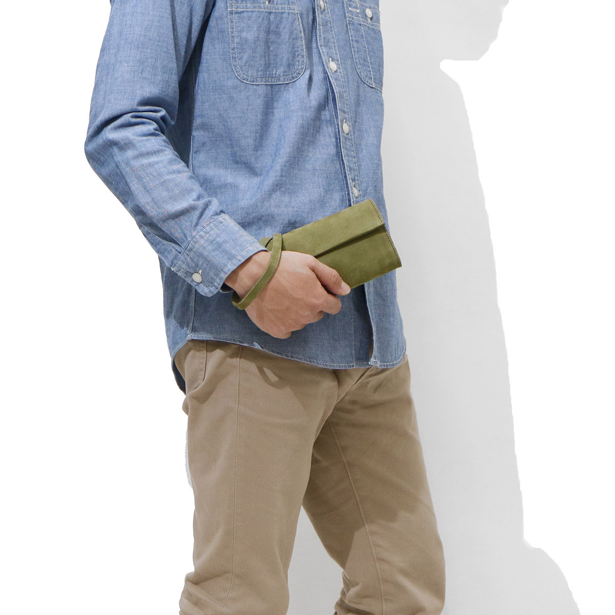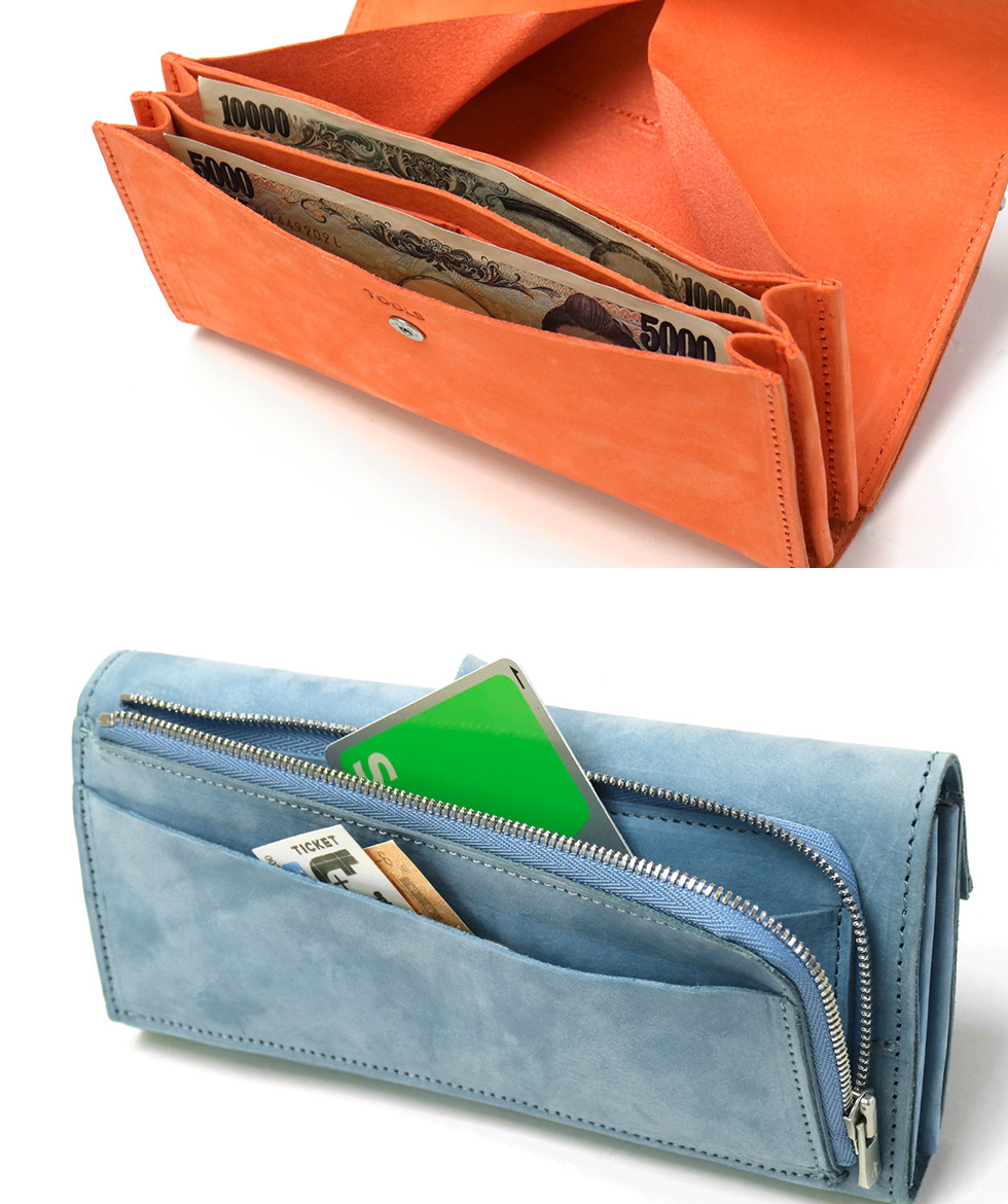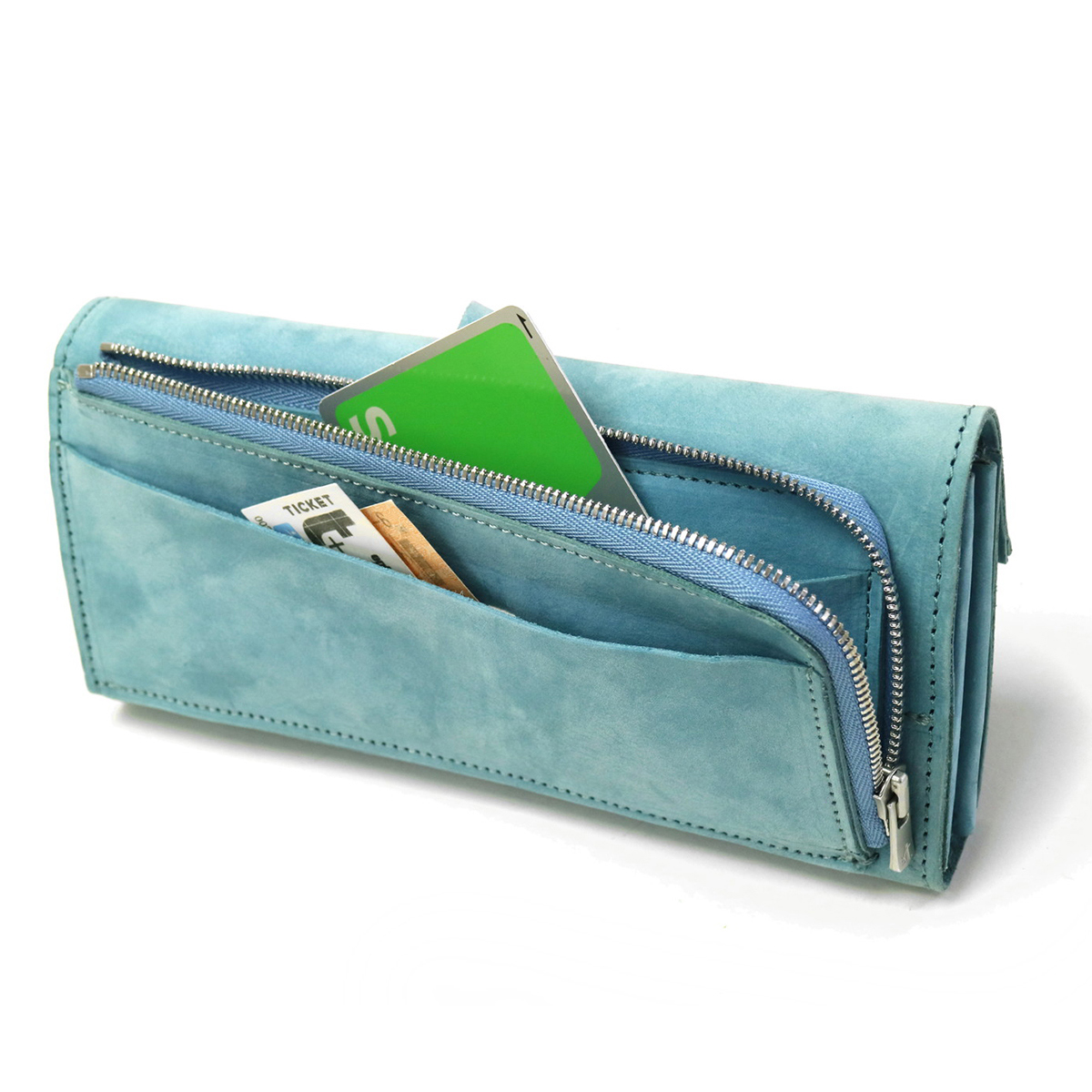 なめらかで柔らかな肌触りが魅力で、毎日に面白みや風情を加えてくれるような遊び心を感じる長財布。美しい発色は見ているだけでも楽しく、触れば心地良く、時間と手間をかけられたきめ細かく丈夫なヌバックレザーを使用しています。
