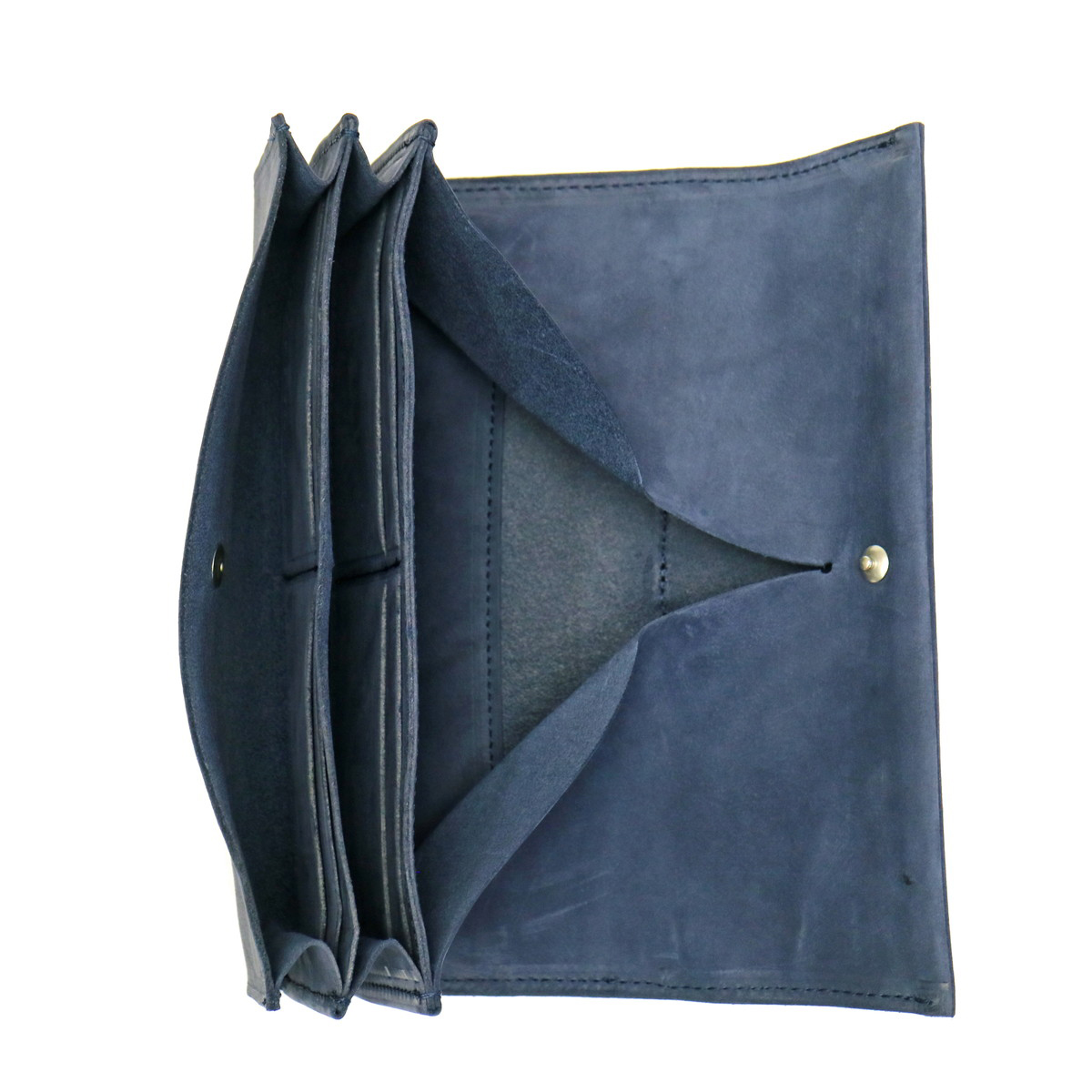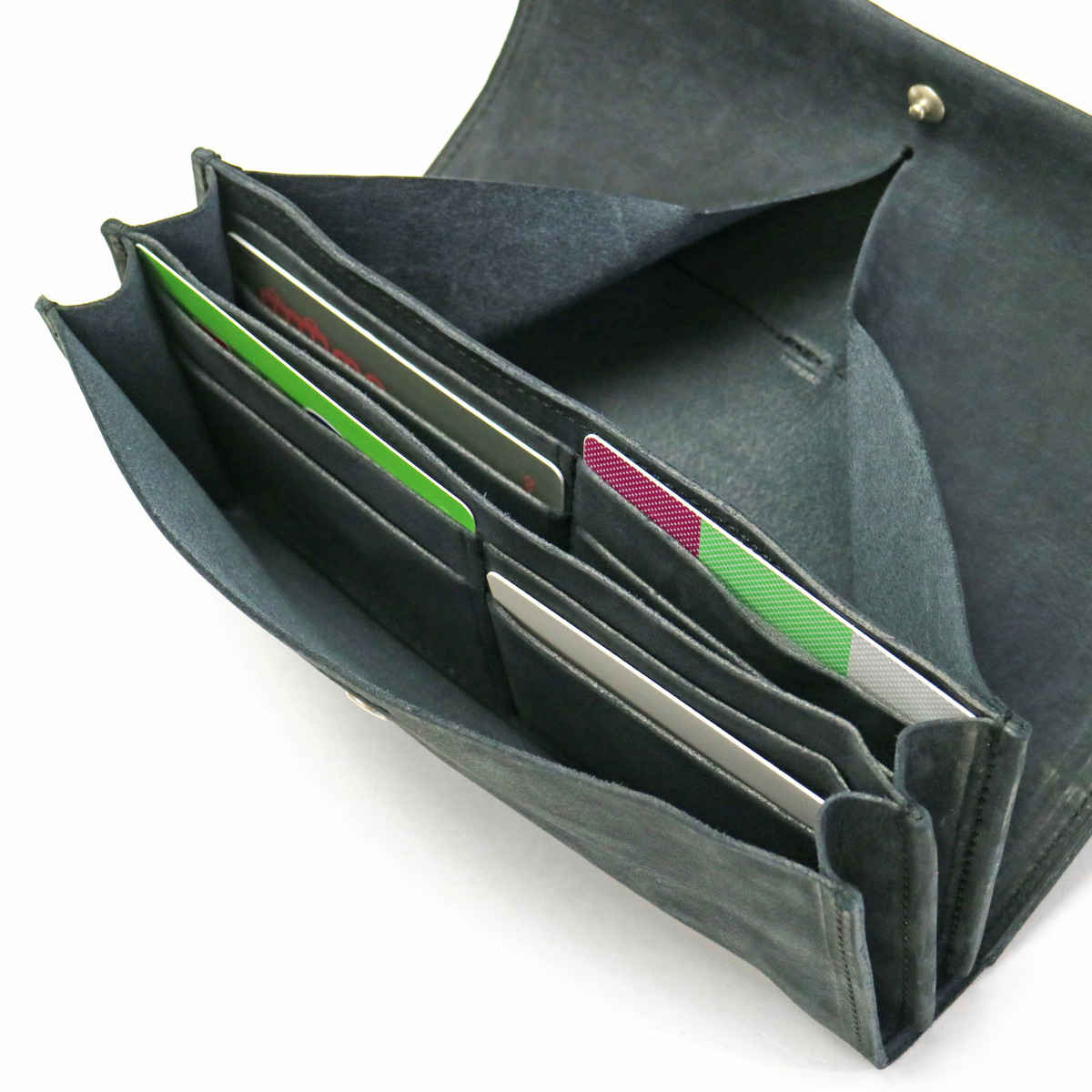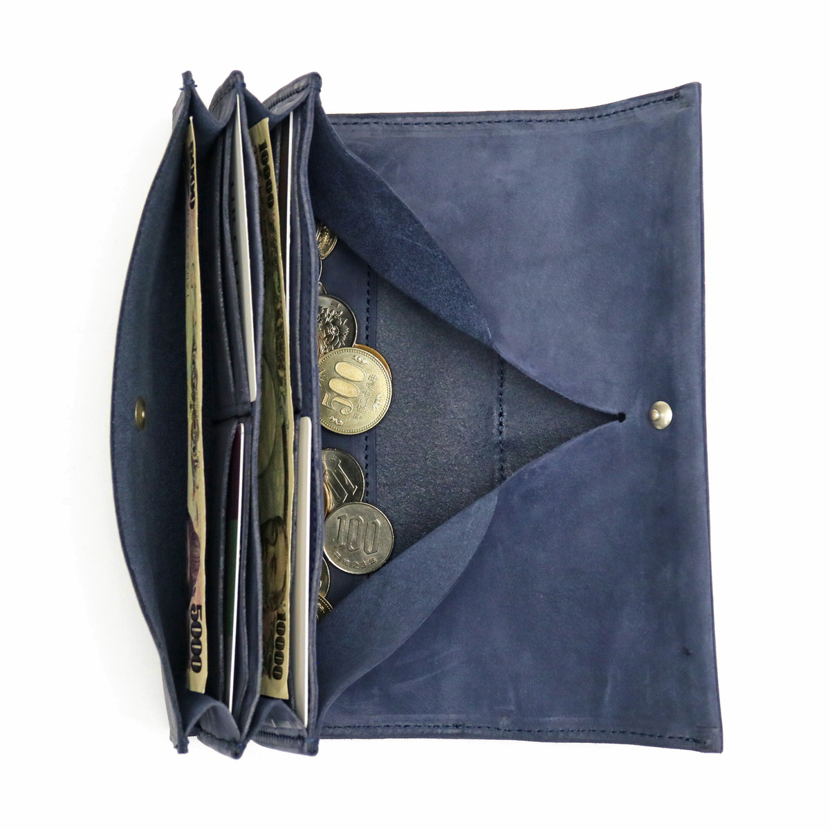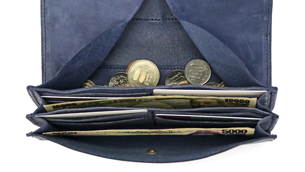 内装は2層の札入れが設けられた種別管理のできる設計。背面にはジップポケットとオープンポケットが装備されており、頻繁に使用するカードや、小銭の収納など、自分なりの使い勝手の良い収納ができます。
