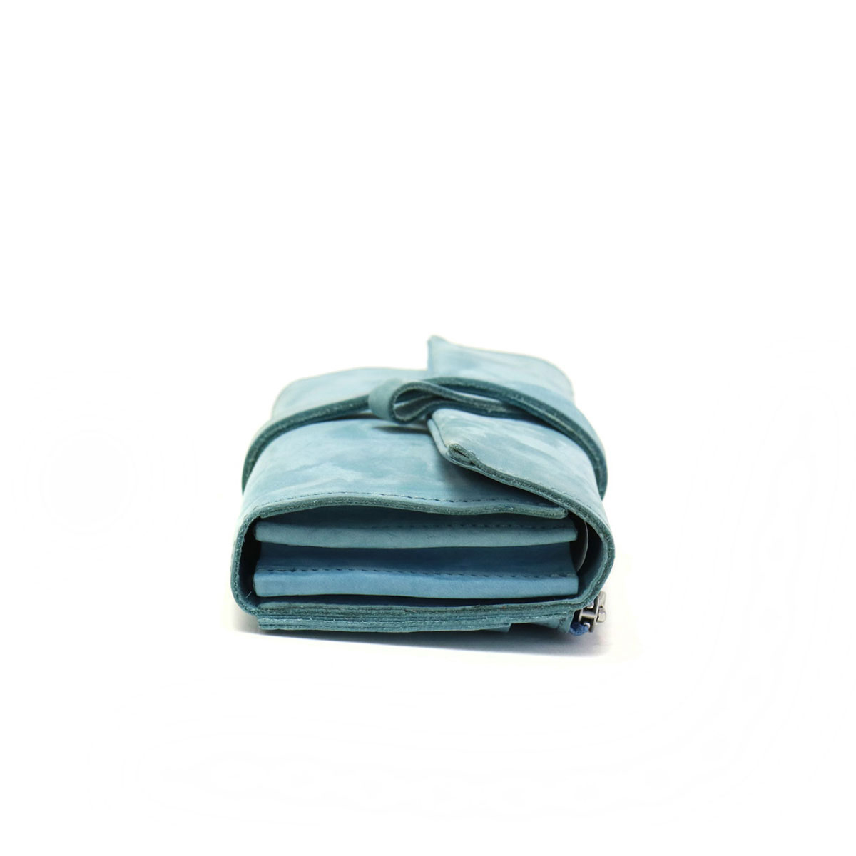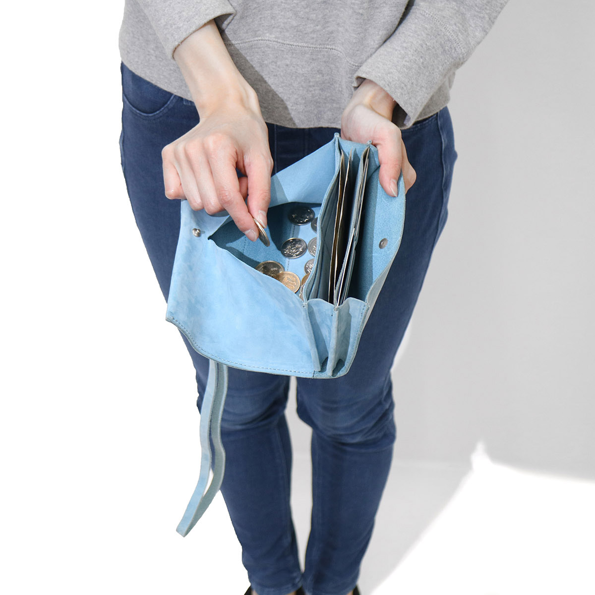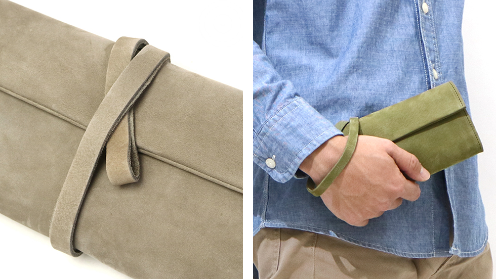 ストラップを設けることによる面白みのあるデザイン。たくさん収納してパンパンになったお財布をぎゅっと結んだり、手首に通してお財布を持ち運ぶこともでき、楽しみの幅の広がるデザインとなっています。