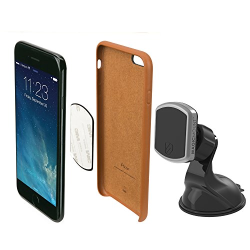 Quick, Convenient and Hands-Free; the MagicMount Pro is a new powerful magnetic mounting system for conveniently mounting your smartphone and devices to the dashboard or windshield in your car, truck, boat or RV. Lock your smart device in place with the Scosche StickGrip suction dash mount featuring a 4-Axis adjustable angle ball joint neck with lock for optimal viewing from any seat. The integrated cable clip lets you neatly connect your cables to the back of the mount keeping cables out of the way. Its cradle-free design eliminates the need to tighten around your device, just hover your device near the magnetic surface and it instantly locks securely in place. These extra powerful N50 neodymium magnets are 30% stronger than the original MagicMount to hold your phone or device securely in place even on the bumpiest roads and are still 100% safe for all modern smart phones and devices. The low profile mount safely attaches to your dashboard using the StickGrip suction cup base and can adhere to windshields, windows, kitchen countertops and all other non-porous surfaces. The easy install and dismantling allows you to take it anywhere you need your phone and mount most. The Scosche Pro mount includes interchangeable trim rings to compliment your vehicle or office.Feature