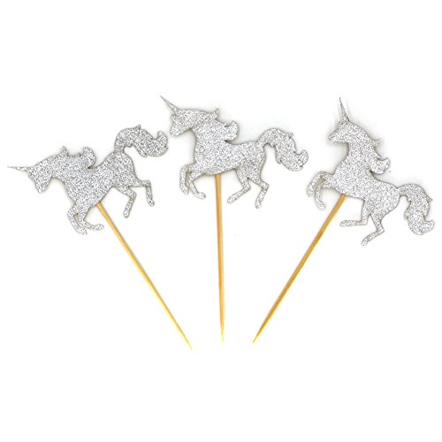Miraclekoo Silver Glitter Unicorn Cupcake Toppers for Bridal Shower, Wedding Table Cake Decorations, Party Supply Favor Accents, 30 Pack