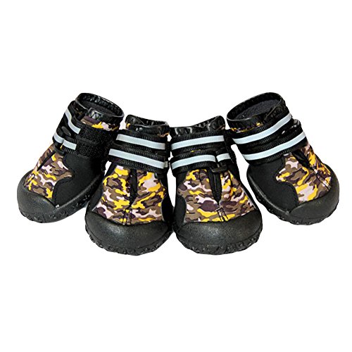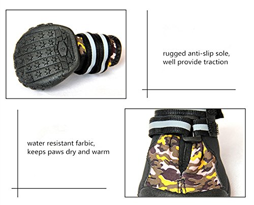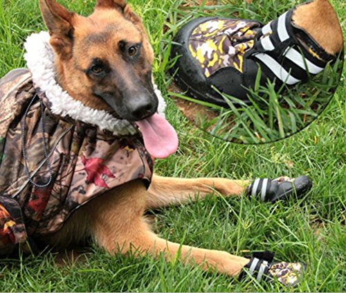 -. Binding : Misc. -. Brand : Julvie -. Feature : Flexible fleece lined interior provides extra comfort / Two long and adjustable straps, capable to prevent slipping off and supply a customized tightness for secure closure / Rugged Anti-Slip Sole , well provide traction and offer serious paw protection in wet and dry, hot and cold conditions / Water resistant shoes keeps paws dry and warm. No more wiping muddy or sandy paws after the rain or snow / Dual Reflective straps for nighttime visibility,make your dog safe at night -. Label : Julvie -. Manufacturer : Julvie -. MPN : DogShoes17081209 -. PackageQuantity : 1 -. PartNumber : DogShoes17081209 -. ProductGroup : Pet Products -. ProductTypeName : PET_SUPPLIES -. Publisher : Julvie -. Studio : Julvie -. Title : Julvie Waterproof Pet Dog Shoes Camo Anti-Slip Winter Boots Paw Protector for Meduim to Large Dogs Labrador Husky Shoes 4 Pcs