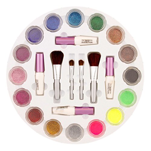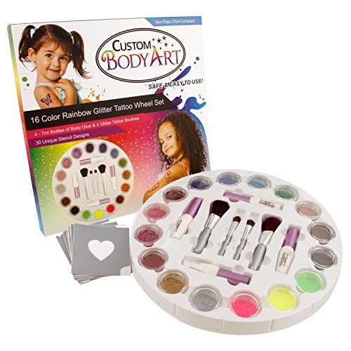 -. Title : Glitter Tattoo Set by Custom Body Art 16 Color Glitter Wheel Body Art Set with 16 Large Glitter Colors, 30 Uniquely Themed Temporary Tattoo Stencils, 4 Glue Applicator Bottles, 4 Glitter Brushes