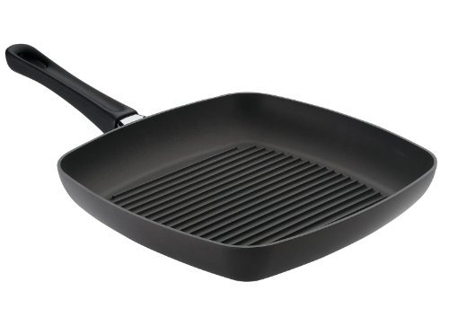 Squeeze-cast recycled aluminum. Non-stick ceramic titanium coating safe for use with metal utensils. Stay-cool black handle attached with patented locking system. Oven- and broiler-proof up to 500 degrees F. Suitable for all cook tops except induction. Dishwasher safe. Includes 10.75-inch grill pan.Feature