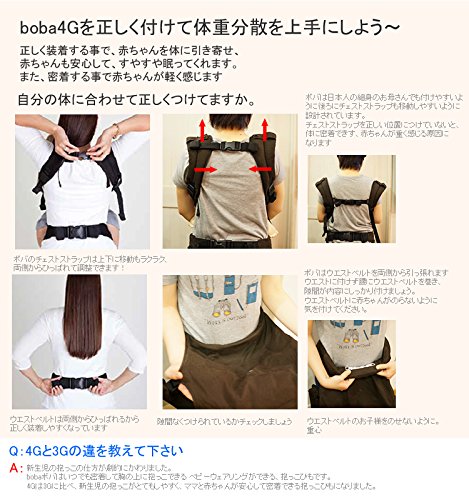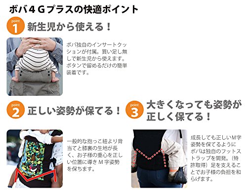 大人気のボバキャリアに新しく4Gプラスが登場! ボバキャリア4Gと4Gプラスの違いは大きく3つ♪ ・キャリア全面生地が大きくなってフルパネルに変更 ・生地はほこりなどが付きにくい生地に変更 ・ロゴが新しいロゴに変更 ボバキャリア4Gプラスは生まれたばかりの胎児の足や背中の形をキャリアの中で維持できるよう、また、生まれた後は、ママに胸の上で赤ちゃんと密着しで抱く事ができるように、新生児の抱き方をとことん研究し、工夫しました。 アメリカの数々の専門家の文献にあるように、ベビーウェアリングができる事で、赤ちゃんの成長に大きく、その後影響を与える事がわかっているため、 生まれてすぐからベビーウェアリングができる抱っこひもが完成しました。 ★生まれてすぐベビーウェアリングができりょうに、赤ちゃんとママが密着して、正しい抱き方ができる。 ★1.5歳をすぎてからも理想のM字型構造の形で抱っこできる、取り外し可能の足置きストラップ付き ★三次元立体縫製と、長めの背あてで、赤ちゃんをママの距離をよりくっつけ、赤ちゃんスペースを損なわず、赤ちゃんとママが密着できる設計のため、体重分散が上手にできる。 ★細めで小さな日本人体系でもぴったりあい、もちろん大柄な人でも違和感のない、装着ができるフリーサイズFeature