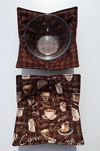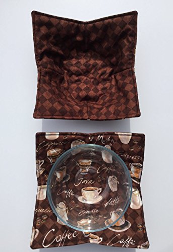 Product Description LISTING IS FOR QTY 1 BOWL COZY AS PICTURED - REVERSIBLE PRINTS (FRONT BACK) FRONT: Coffee print BACK: Brown Black check print Square corners SEE OTHER LISTINGS FOR MATCHING SERVING BOWL AND /OR PLATE COZY (available if listed) This is one of best ways to warm your food in the microwave. Simply place your bowl inside the microwave cozy, place it in the microwave, close the door.Please use 2-3 minute increments until your food is as hot as you like. Lift out of the of the microwave using the extended opposing corners. Love ice cream? Use your bowl in the cozy and it will keep your fingers from feeling ice cold and help your ice from melting so fast. The measurement of the cozy shown measures approximately 8 - 8 1/2". AS PICTURED - REVERSIBLE PRINTS (FRONT BACK) Safe to machine wash dry (you may prefer to hang for air drying) REMEMBER: Use 2-3 minute increments for heating your food. Anything can burn/catch fire if left unattended or for long enough. We have used 100% cotton fabric, thread and Wrap N Zap 100% cotton batting. Please do not leave unattended. ***Do not for use in a regular, toaster, or convection oven.*** The bowls shown in the pictures not included. See our store for other color schemes and themes. Made in smoke free - pet free home. 0