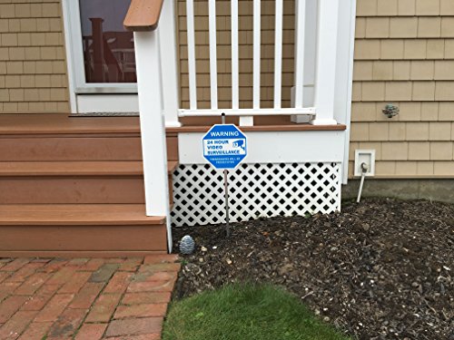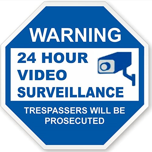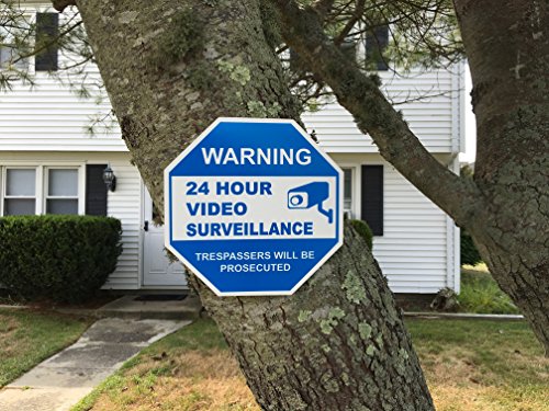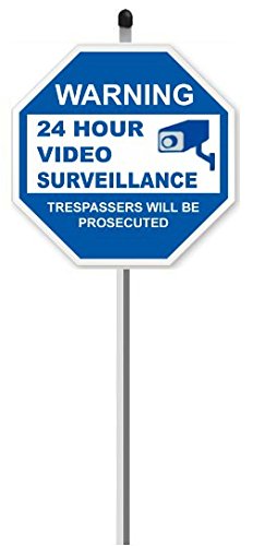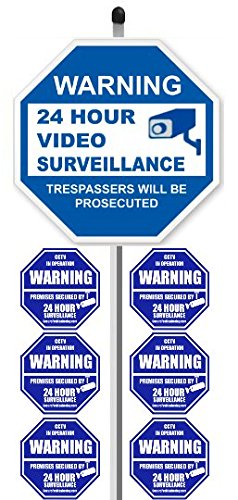 Package includes: ONE premium quality 9" x 9" blue and white octagon plastic sign mounted to a 36" long aluminum stake and includes SIX 3" x 3" CCTV security stickers.